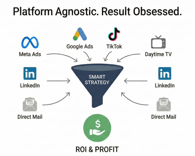 If the data says your audience is on TikTok, we build for TikTok. If the data suggests Daytime TV or Direct Mail will yield the highest ROI, that is what we execute. We fit the platform to the strategy, not the other way around.