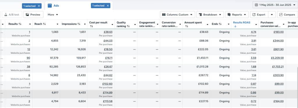 As you can see from the results, very quickly we paused the ads generating less than 1.5 x ROAS and increased budgets steadily for 4x ROAS